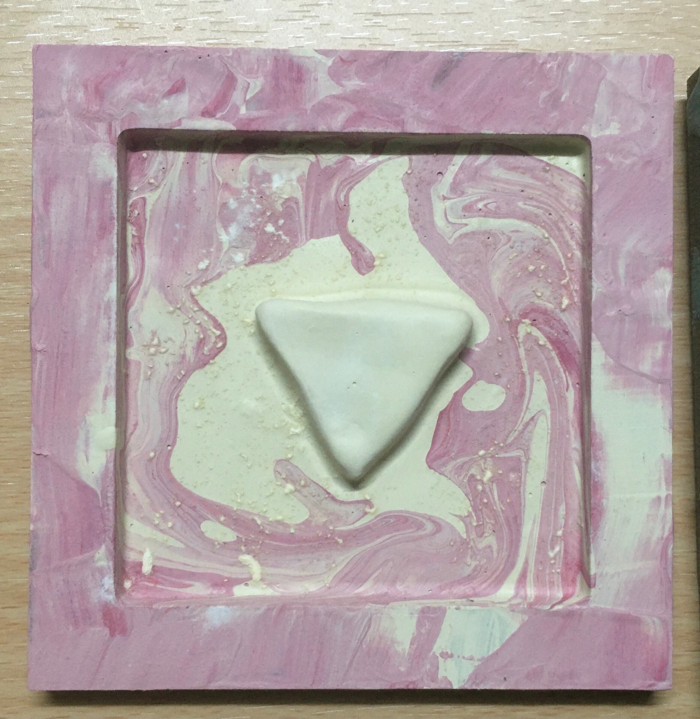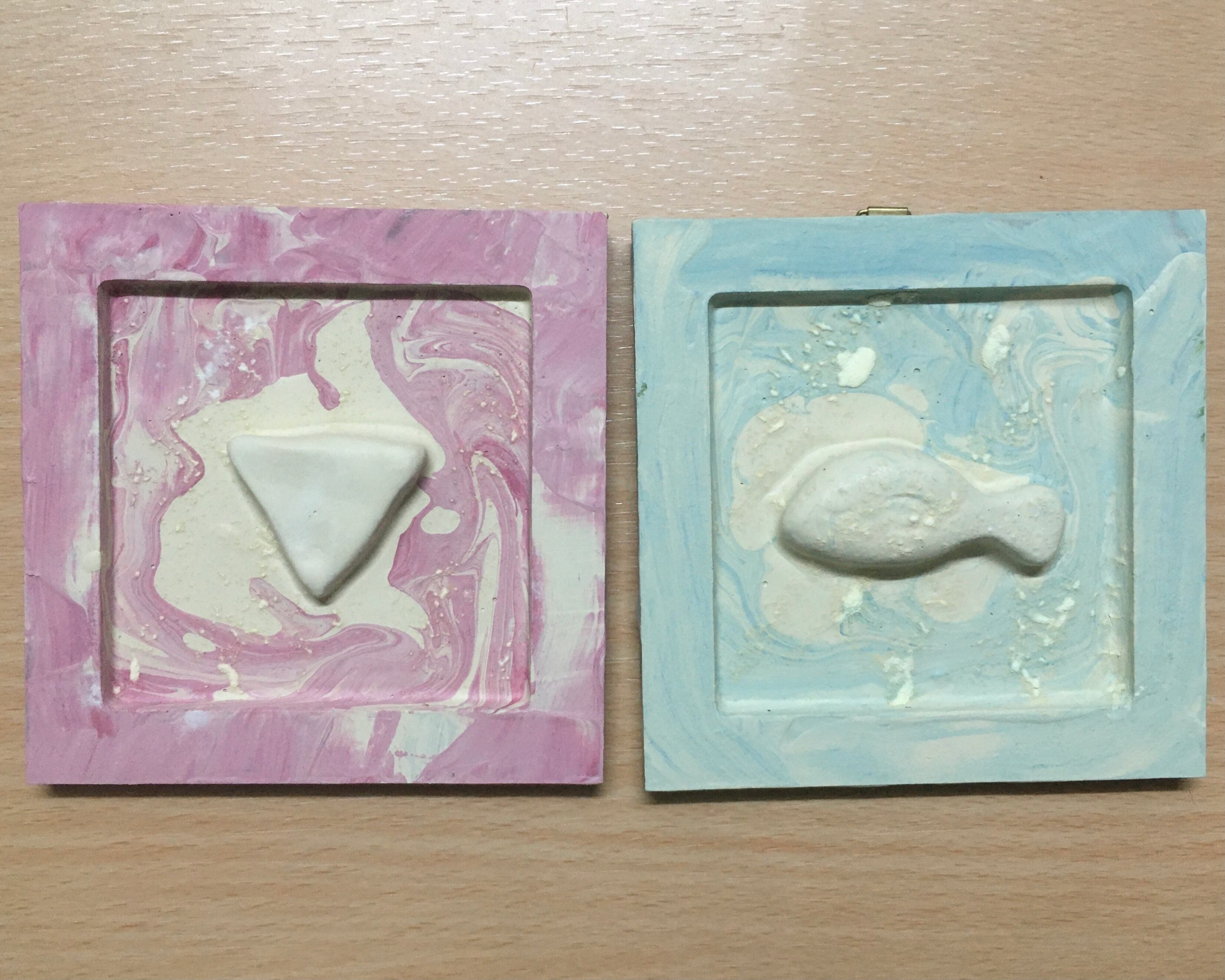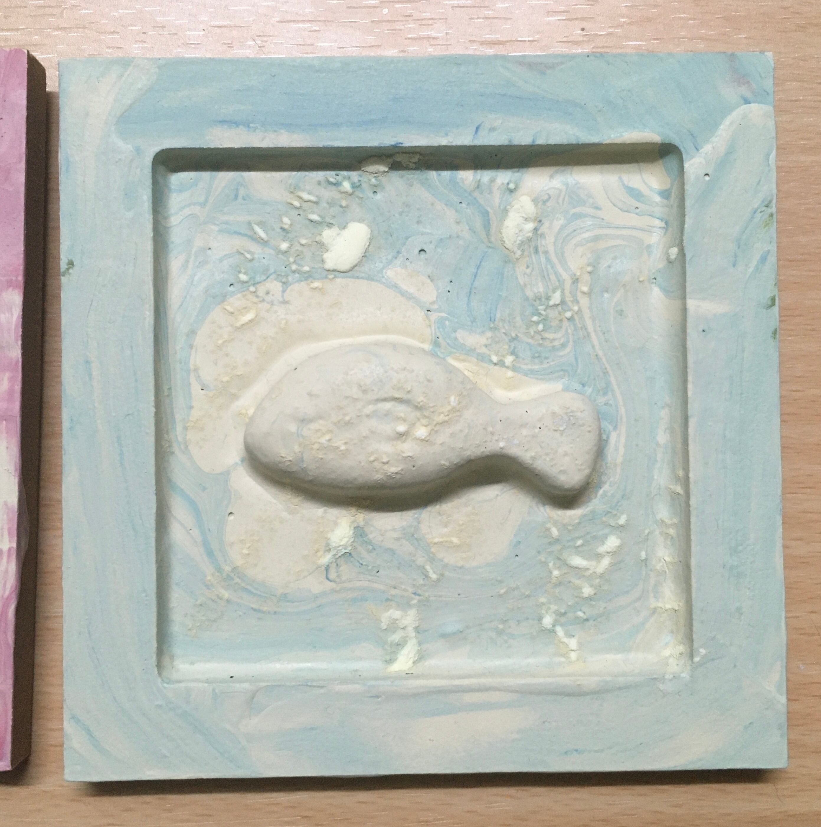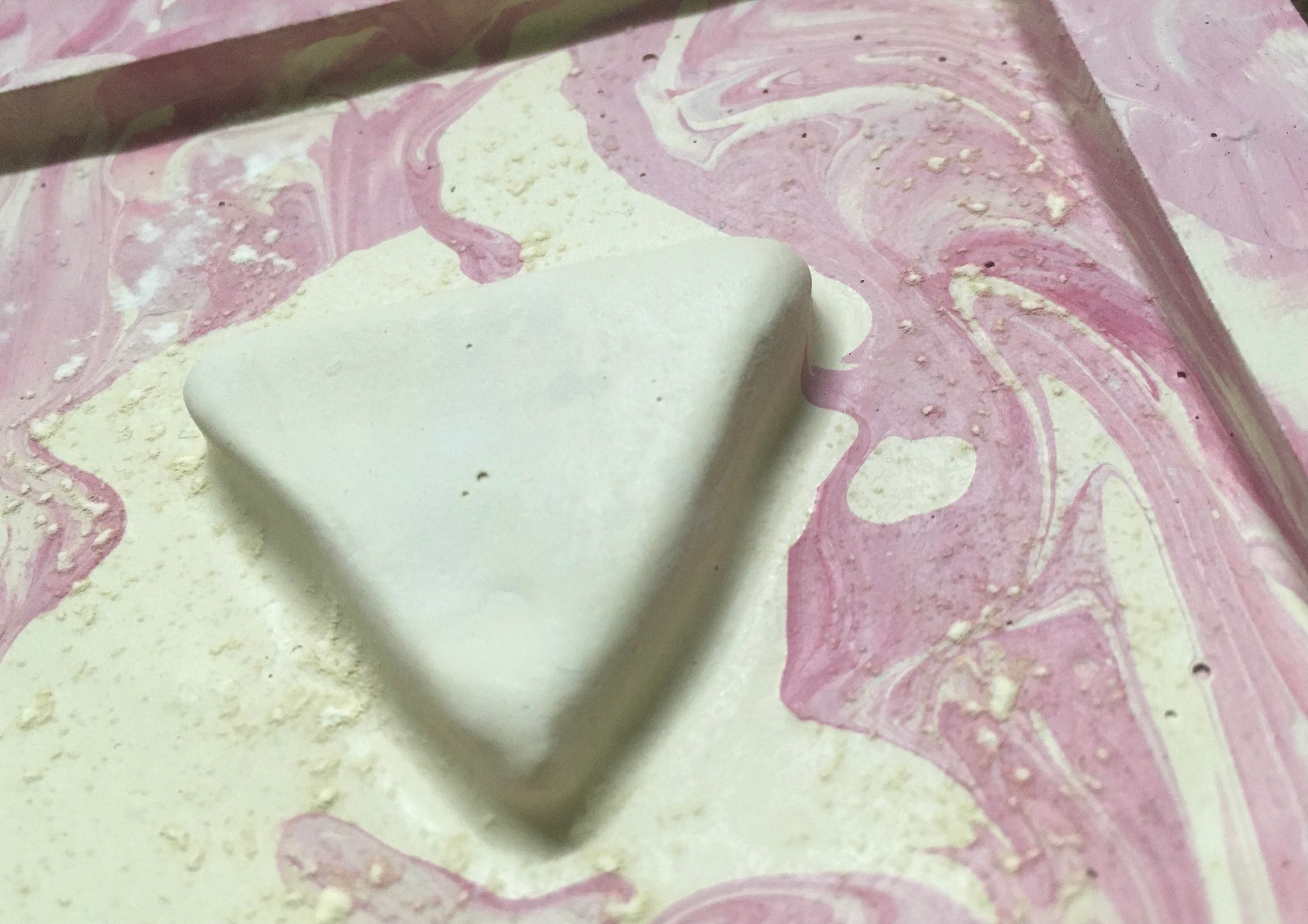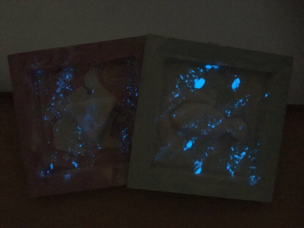 しろいつぶつぶが青色の蓄光塗料になっています、光を当てた後暗くすると光ります。